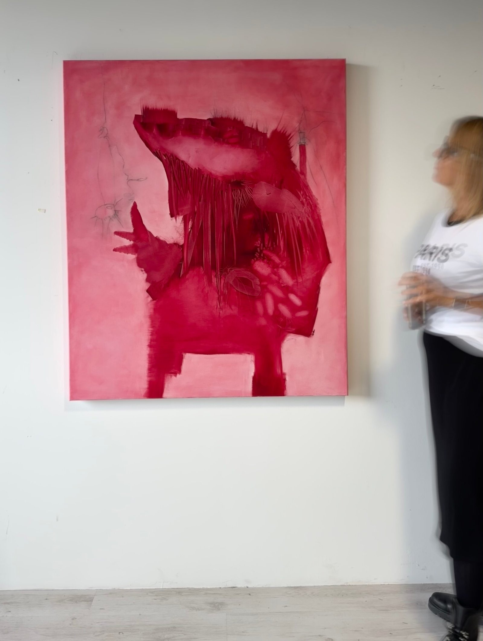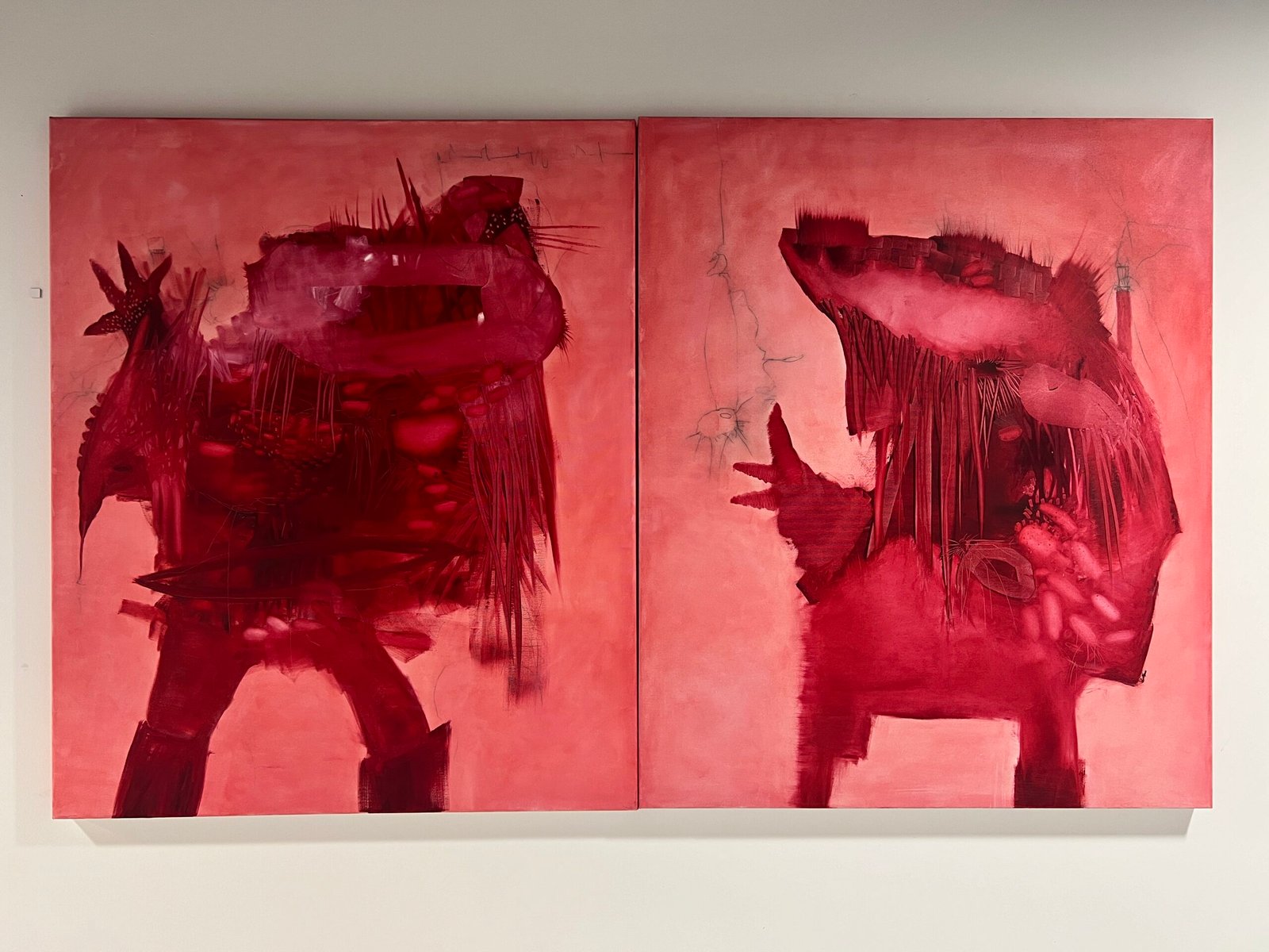 Die Werke Ode Ma Musis 1 und 2 von Nicola Barth, Öl auf Leinwand, thematisieren zentrale Aspekte ihres Schaffens wie Transformation, Metamorphose und die Verbindung von Mensch und Natur. Die beiden monochrom in Rot gehaltenen Leinwände zeigen dynamische, sich wandelnde Formen, die an anthropomorphe oder tierähnliche Figuren erinnern, jedoch bewusst mehrdeutig bleiben. Die Arbeiten greifen das Motiv der „Dahinterwelt“ auf, einer verborgenen Dimension jenseits des Sichtbaren, in der sich das Figürliche ins Abstrakte und das Organische ins Imaginäre verwandelt. Zerbrechlichkeit und Stärke, Chaos und Ordnung sowie Licht und Schatten durchdringen sich, wodurch ein ständiger Wandel spürbar wird. Die poetische Titelwahl verweist auf die Muse(n) als Quelle von Kreativität und Inspiration. Die Werke schaffen eine emotionale Intensität und laden dazu ein, intuitiv und individuell auf die Themen des Lebens, der Veränderung und der verborgenen Realität zu reagieren.