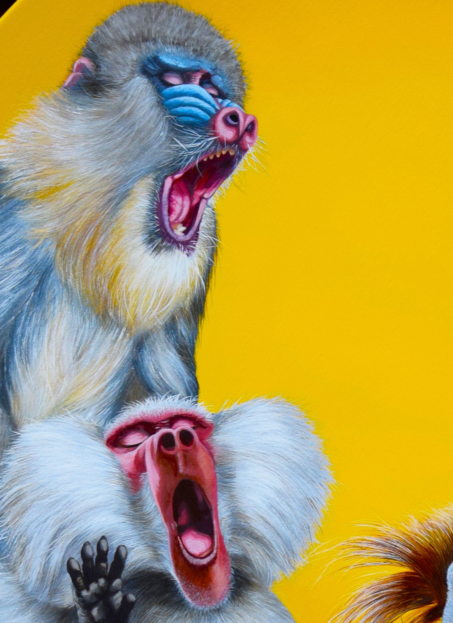 Ode to Joy (2024) 74 cm circumference, oil on canvas My painting is named after one of Beethoven's best-known works, Ode to Joy, the text was written by the German poet Friedrich Schiller in 1785. The work is the fourth movement of Beethoven's 9th Symphony, with four soloists, chorus and orchestra. The Council of Europe made Ode to Joy the national anthem of Europe in 1972. It draws attention to how important it is to practice the qualities of love, such as devotion, acceptance, tolerance, self-sacrifice, altruism, brotherhood. My painting was inspired by this, but I wanted to approach these from a light side, so I used four different monkeys with funny faces as they indulge in singing. They symbolize unity despite their differences in this image.