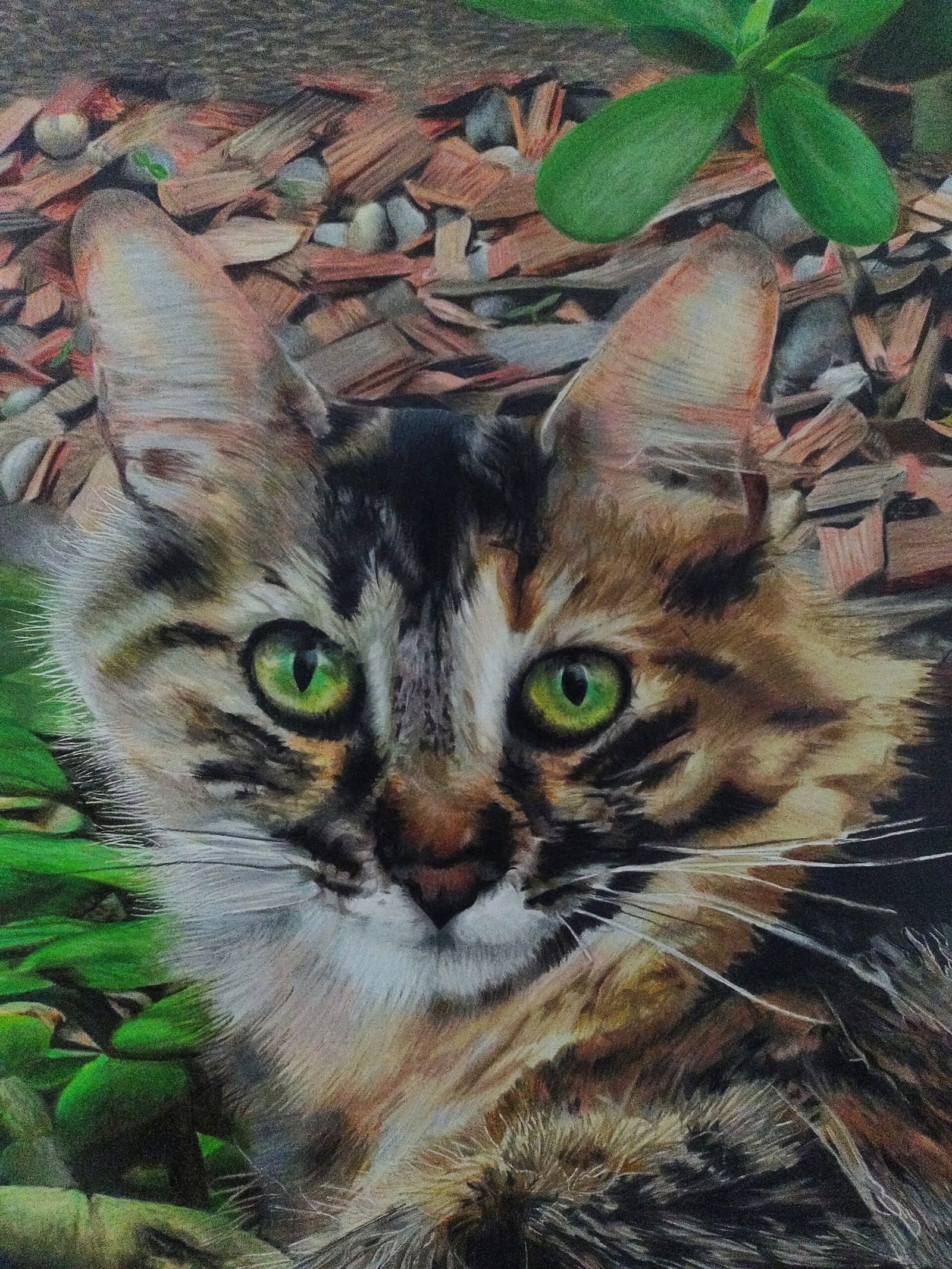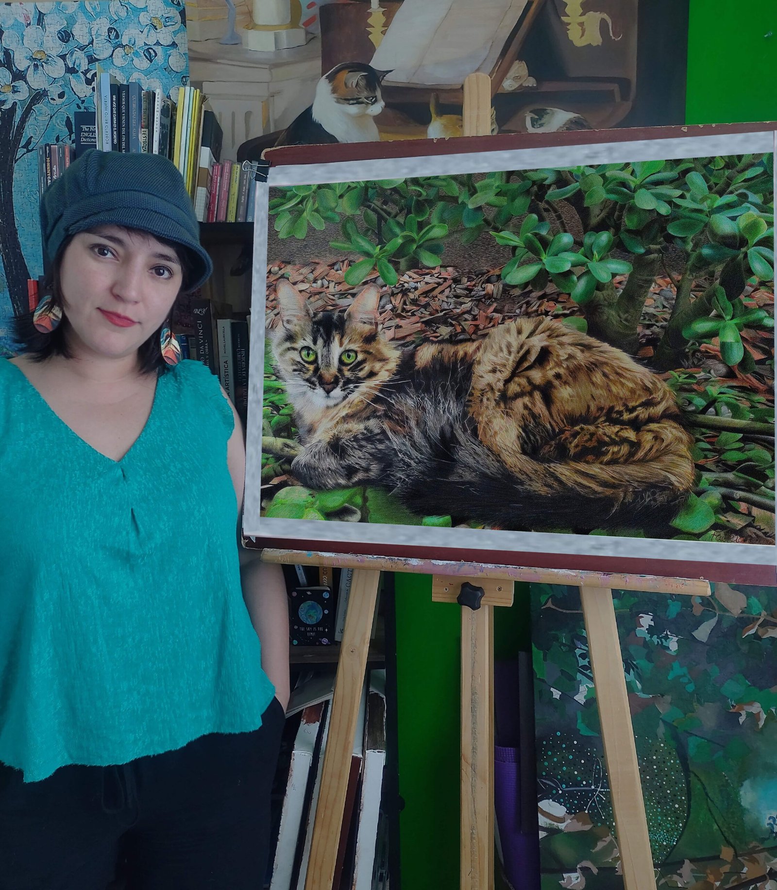 Ofelia es mi gatita. Ella es muy tierna y misteriosa. Le gusta pasar gran parte del tiempo descansando del sol nortino en el jardín, buscando algo de sombra, también le gusta jugar con el agua de la regadera cuando riego las plantas de mi jardín. Todo ello fue una inspiración para crear la obra, además de sus colores característicos que se entremezclan con los colores propios de la naturaleza.