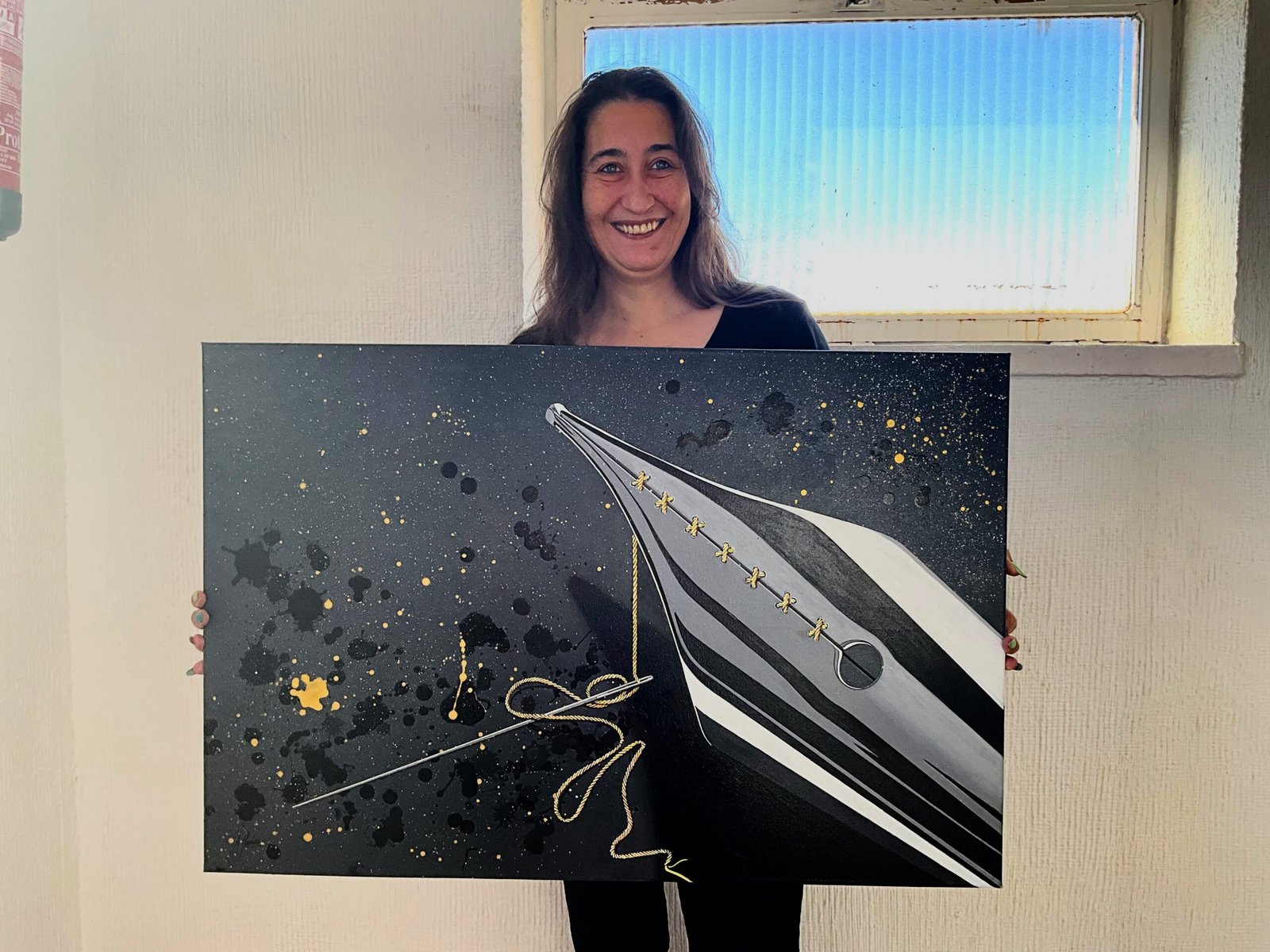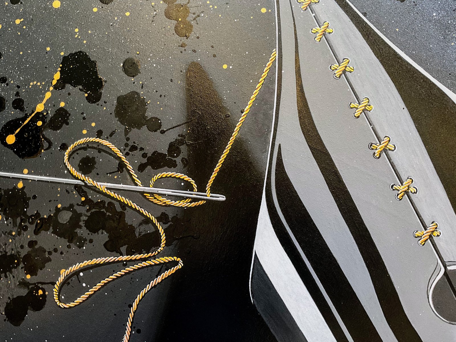 En esta representación de la libertad de expresión (de la que la interpretación queda en manos del espectador) se ha utilizado un efecto metálico en el hilo dorado imposible de apreciar en una fotografía. Aporta un efecto importante a la obra, dotándola de un simbolismo que completa su mensaje.