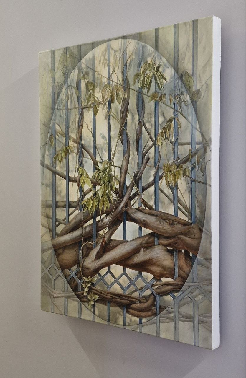 This painting is a mirror of our modern times, where the liana symbolizes humanity, and the lattice - technology and civilization, within which we exist. All this is intertwined and tied into an insoluble Gordian knot. The vitality of the liana, its strength, tenacity, ability to survive, plasticity, variability in the process of adaptation to the surrounding reality, all this resembles human nature, and even the intertwined trunks of the liana resemble human bodies transforming in the process of life. At the beginning of the path, the living clings to the non-living. The plant clings to the support in order to, leaning on it, move towards the light and live, but over time, the living grows, changes and increases, and the support remains the same. We are also talking about the interaction of the living and the non-living, the artificial and the natural. About the interpenetration, antagonism or fusion of opposite entities. We are on the threshold of a new era. What awaits us? Struggle