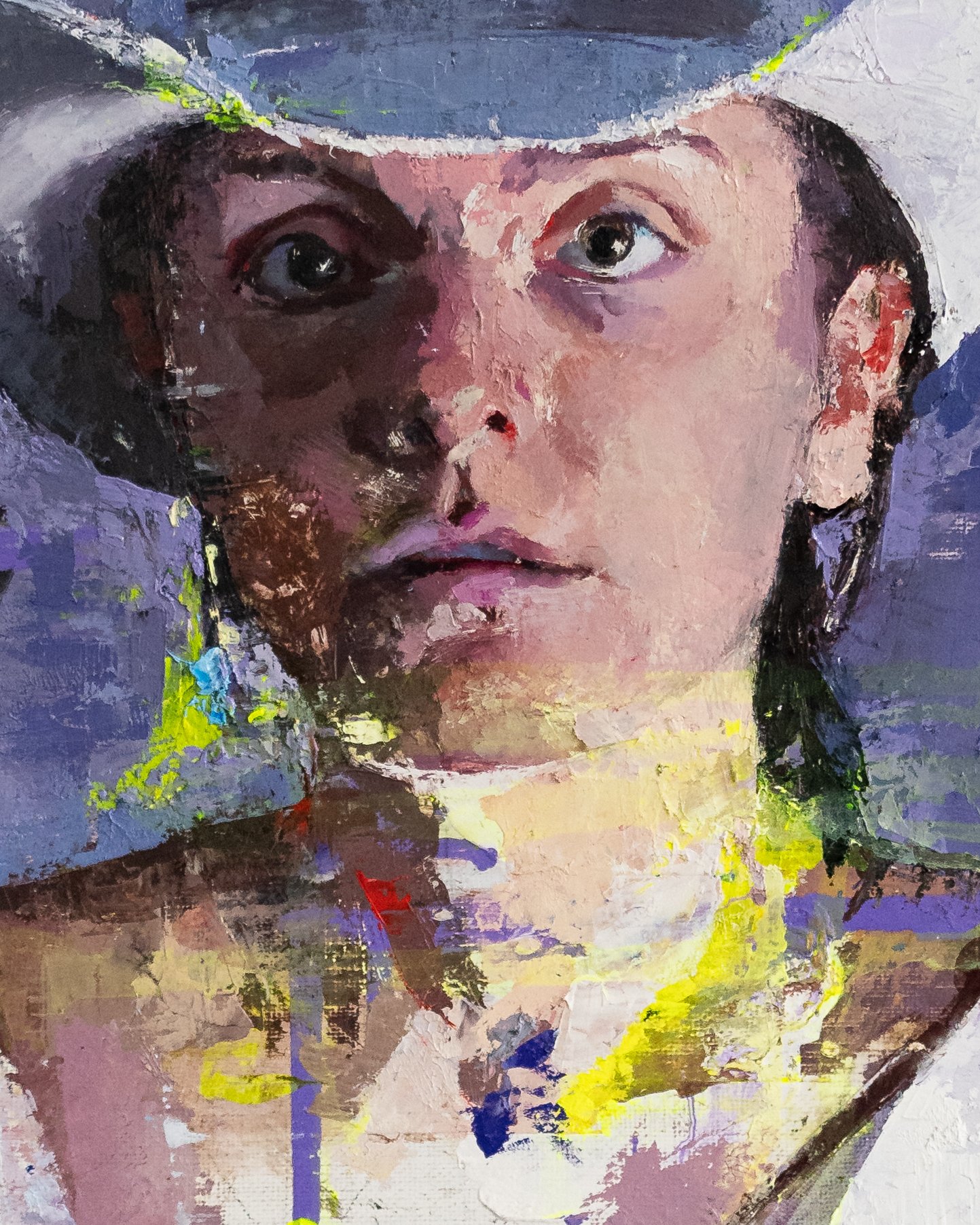 This is a portrait of my sister in her wedding dress. My sister is eight years younger, I wanted to capture the feeling of surreality I have seeing her get married. The painting is also about my feeling of closeness and empathy toward her, I wanted the texture and yellow to feel like the figure dissolves around her heart, this is also the center of the composition.