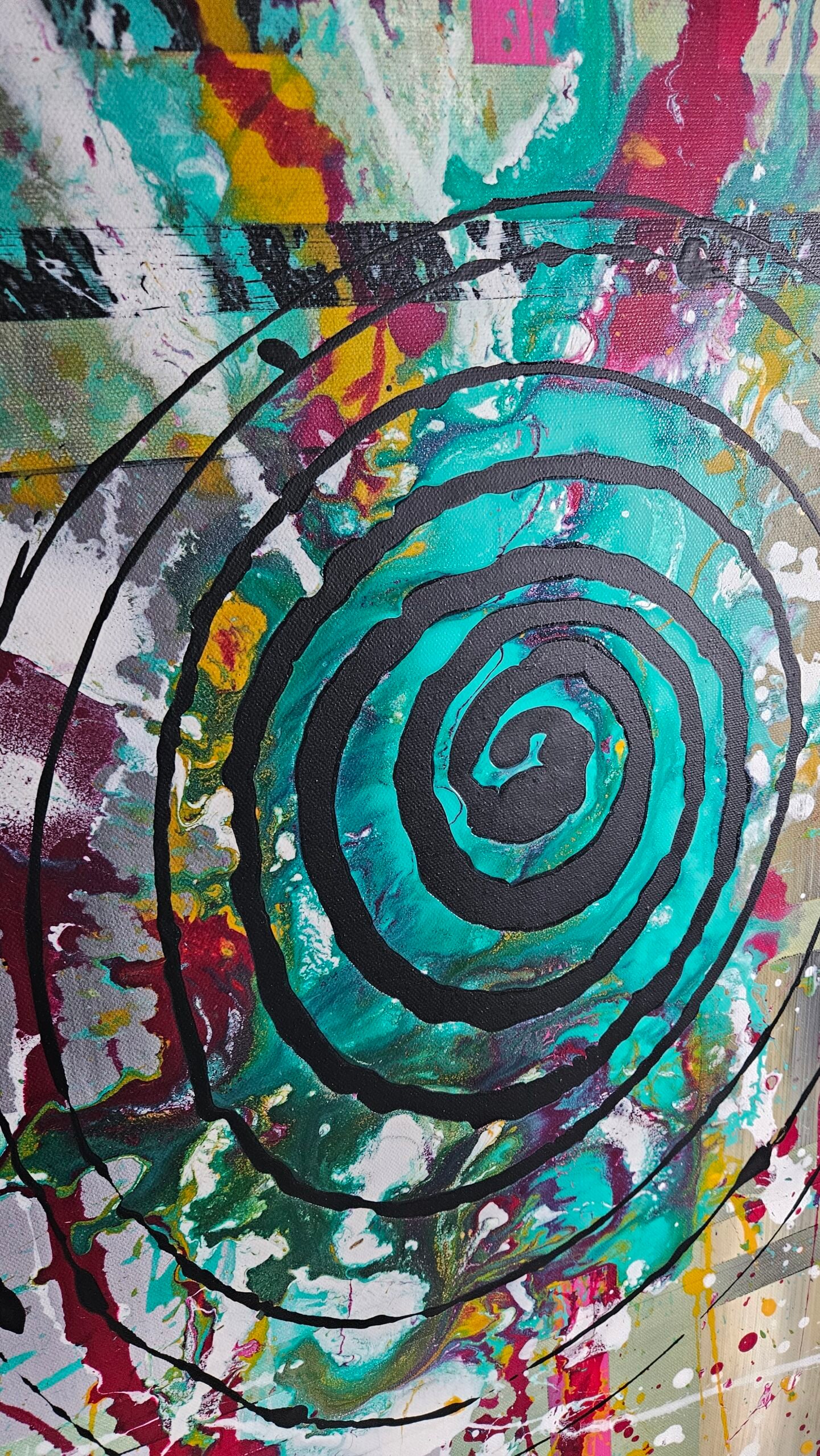 Psyché est une plongée bi-dimensionnelle qui consacre les manifestations conscientes et inconscientes de mon esprit. Au premier plan, la spirale émotionnelle est nourrie par le libre cours de la peinture en employant des techniques de pouring. C’est l’aspect imprévisible de qui je suis. En trame de fond, j’ai choisi d’associer rectangles et longues bandes traversantes, qui sont l’aspect fondamental de ce que je vois de moi. Psyché est la matérialisation d’une démarche introspective qui selon moi, devrait être réalisée par chacun d’entre nous, que l’on soit artiste ou spectateur, car résolument humain.