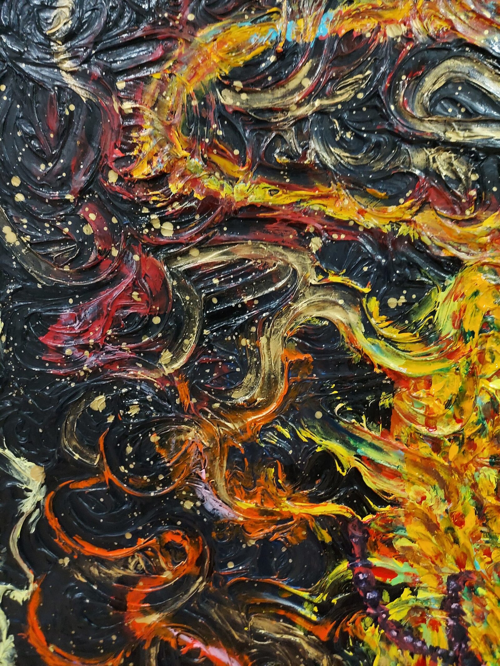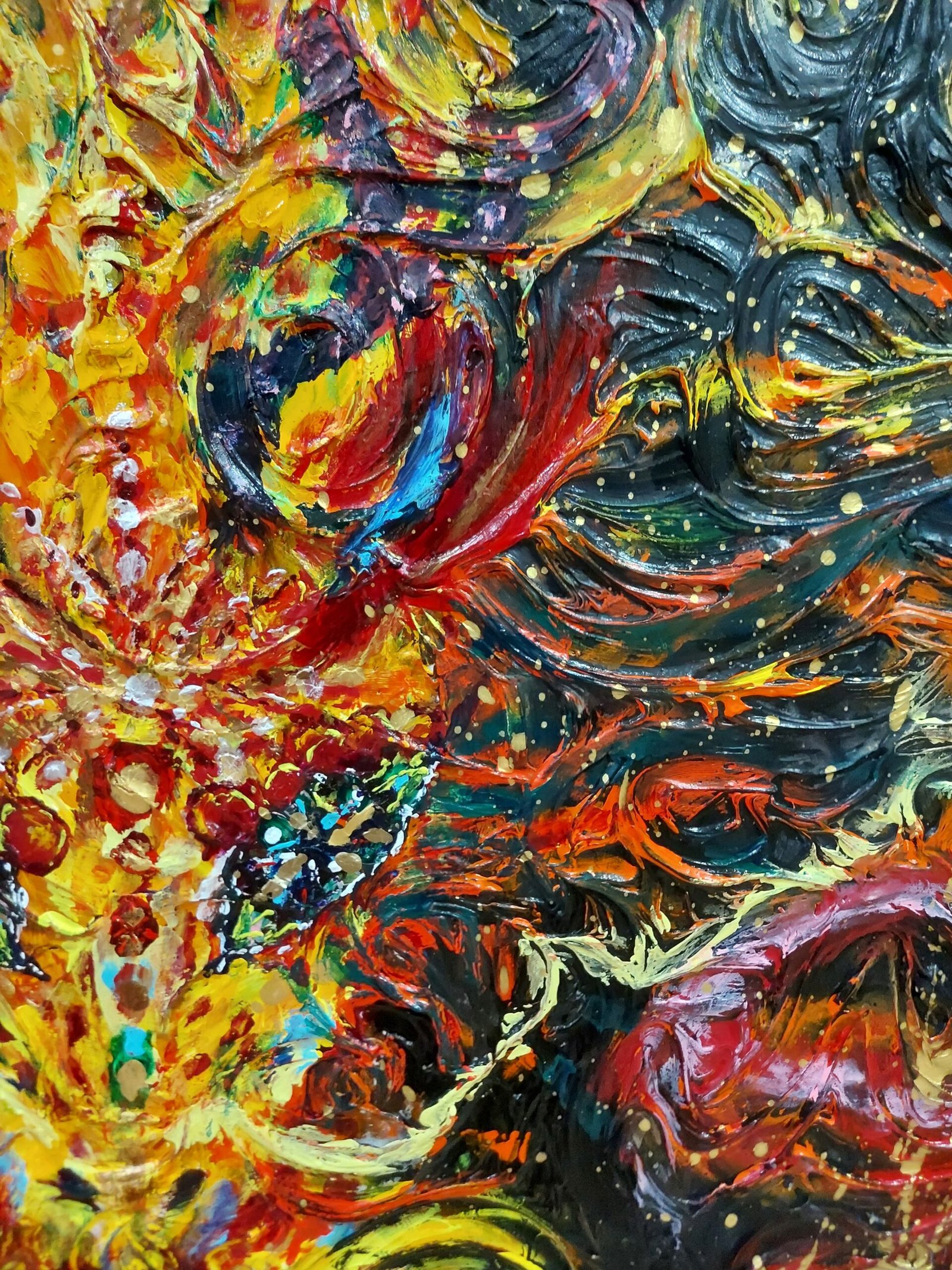 All painted with fingers and fingernails. Also the bumpy swirls of the undercoat. I paint with my fingers and fingernails to falsely represent my heart and wishes.The bumpy vortex represents the many edges of life. That it is nice not to have to flatten and hide the hard and painful things. It represents that there is always happiness on top of it.The Qilin, the rightful owner of happiness. Light and happiness in the hearts of those who see it. While flying the flame of happiness. May you run through this age of stormy seas bravely.