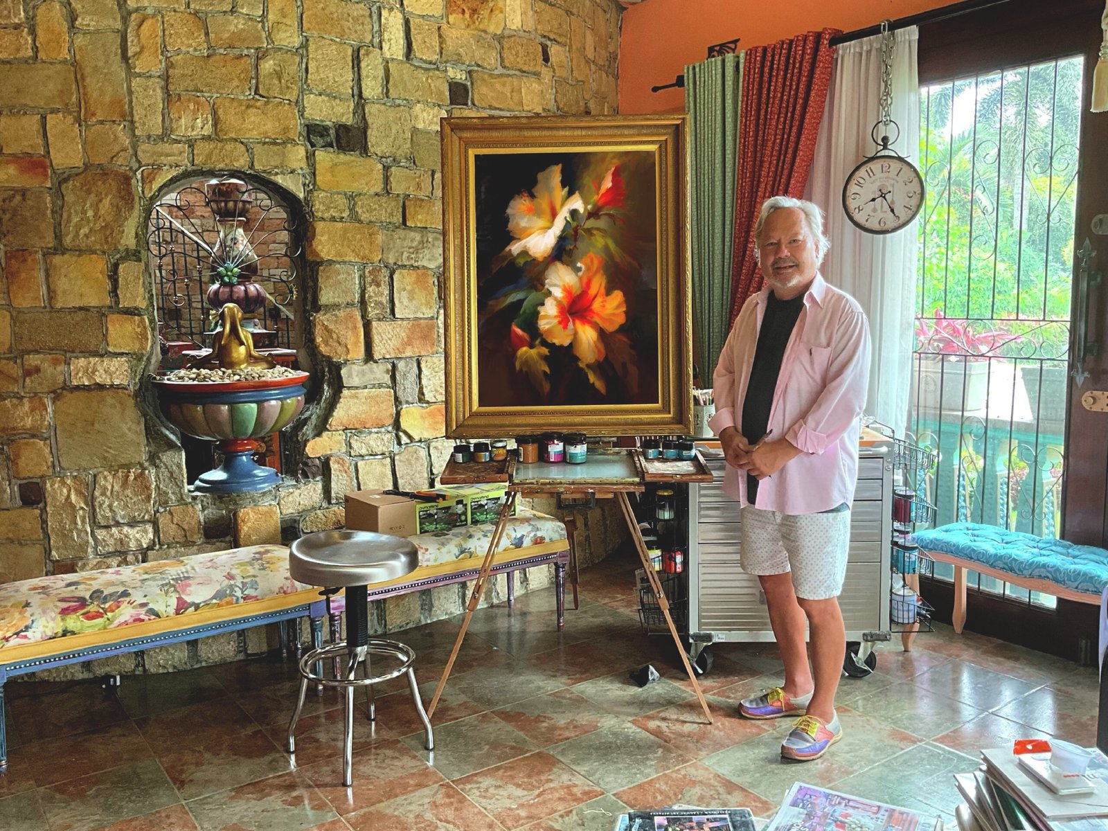 This painting presents a stunning close-up of hibiscus flowers, their delicate petals bursting with warm tones of orange, red, and cream. The rich contrast between the vibrant blossoms and the dark, shadowed background creates a sense of depth and intensity. The composition captures the fleeting beauty of nature, with the flowers seeming to glow from within, their soft yet bold colors symbolizing vitality and elegance. The subtle interplay of light enhances the painting's overall harmony, making it a celebration of nature’s grace and brilliance.