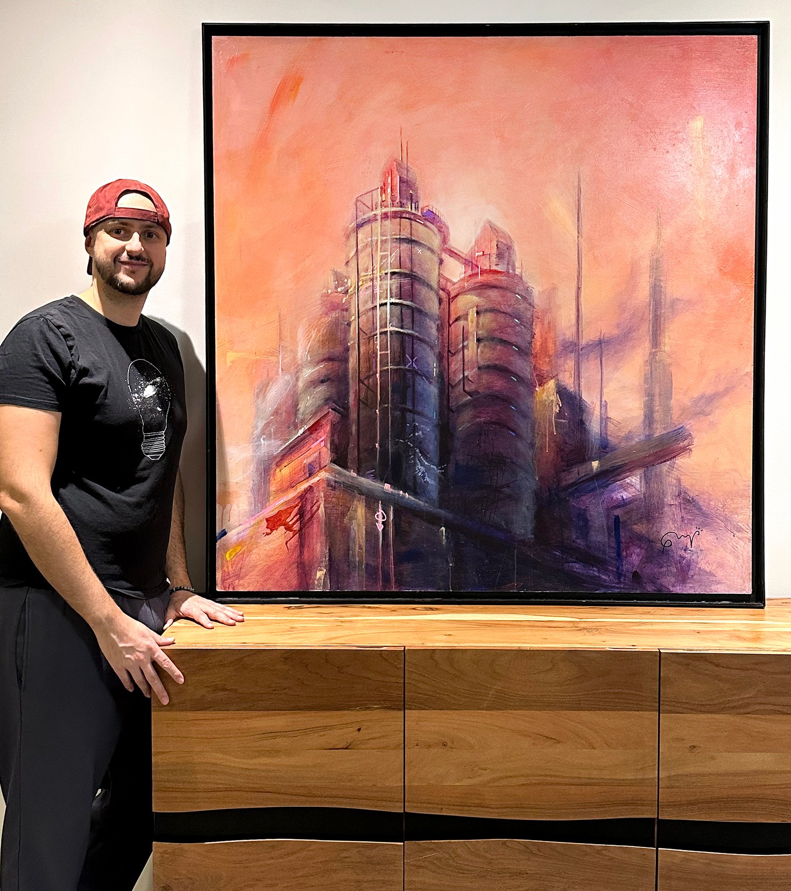 Entre la neblina se dibuja un entramado de metal. Una refinería. Técnicamente, es una obra realizada en acrílico en colores cálidos.