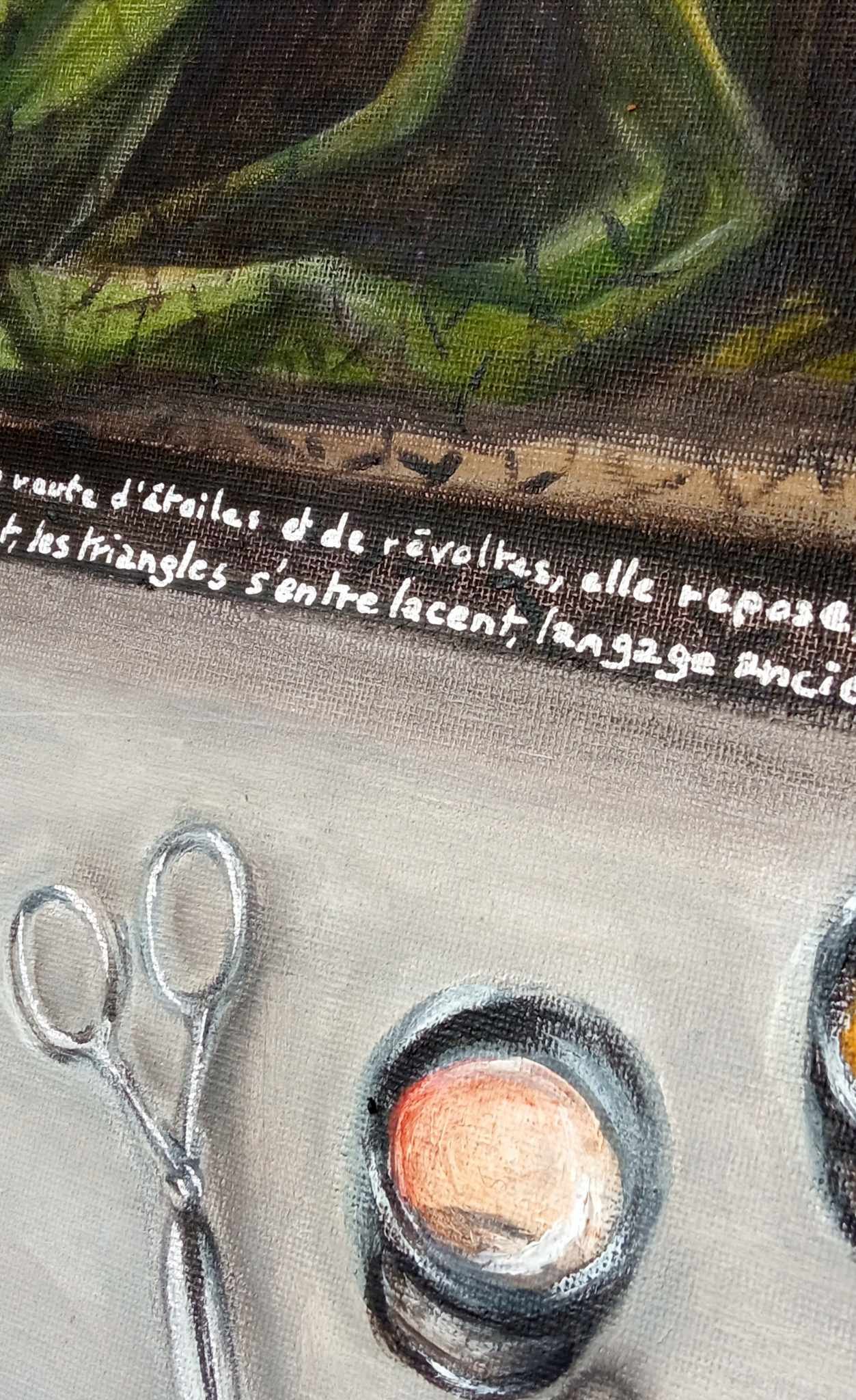 Les femmes ne se contentent pas de donner la vie. Elles bâtissent, créent, transmettent. Pourtant, l’Histoire les a souvent réduites au silence, effaçant leurs œuvres, leurs idées, leurs combats. Dans ce face-à-face entre passé et présent, les silhouettes se répètent, enfermées dans un cycle qui refuse de se briser. Les générations passent, mais les injonctions persistent. Ce que l’on imposait aux mères, on le murmure encore aux filles : « Sois douce. Sois mère. Sois discrète. » Comme si l’ambition, la création, la liberté d’exister autrement qu’à travers un rôle prédéfini n’étaient pas envisageables. Les contrastes de ce tableau ne sont pas un hasard. Ils dévoilent l’affrontement entre un passé écrasant et un présent en quête de réparation. Comme un chantier de restauration, il recolle les morceaux d’une mémoire fracturée, révélant ce que l’on a voulu cacher : la place des femmes dans l’art, la transmission, la construction du monde. Il est temps de restaurer l’Histoire.
