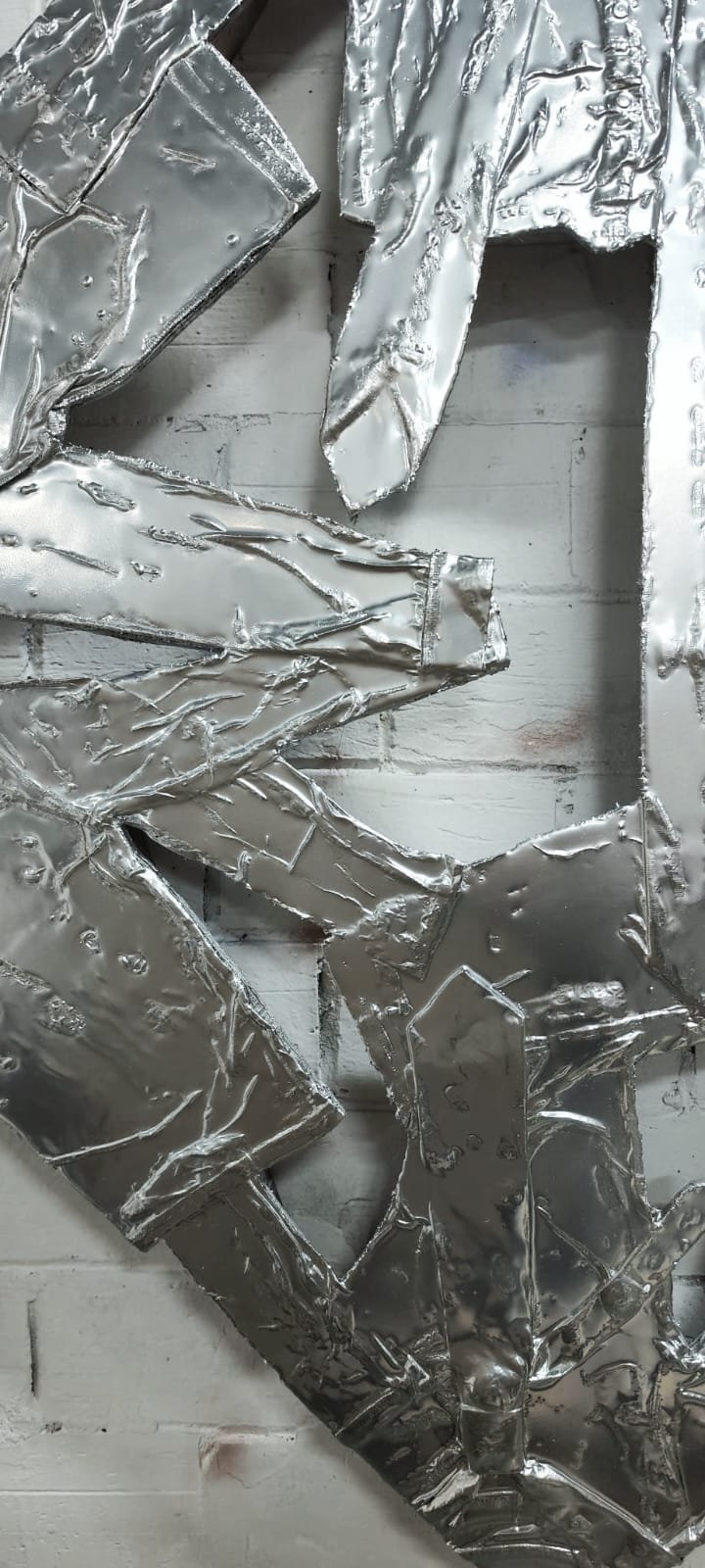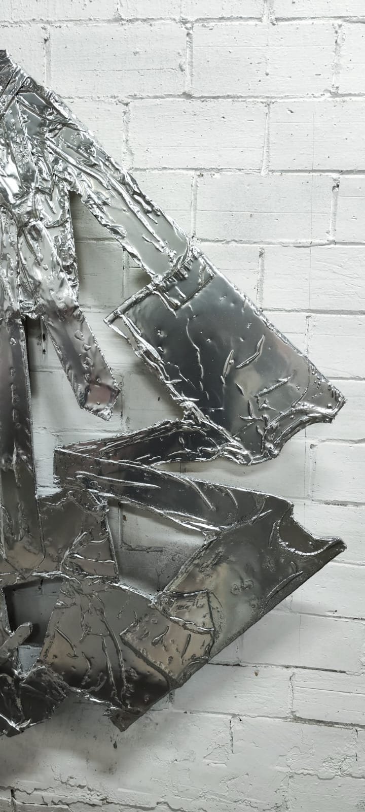 La obra es una composición de prendas de ropa cuidadosamente dispuestas, donde el yo interno y el externo se entrelazan en una pieza plateada y cromada. Este material, semejante a un espejo, refleja al espectador y lo invita a contemplar el principio de psicología llamado la Ley del Espejo . Cada prenda actúa como un símbolo de identidad, entrelazando la imagen que proyectamos al mundo con la verdad interior que a veces mantenemos oculta. Al observarse en la superficie cromada, el espectador no solo se ve reflejado físicamente, sino que también es confrontado con las proyecciones de su propio ser interior. La obra invita a la reflexión sobre cómo nuestras percepciones y juicios del entorno son, en realidad, un reflejo de lo que llevamos dentro. Lo que criticamos o admiramos en los demás no es más que una extensión de nuestro propio universo emocional y psicológico.