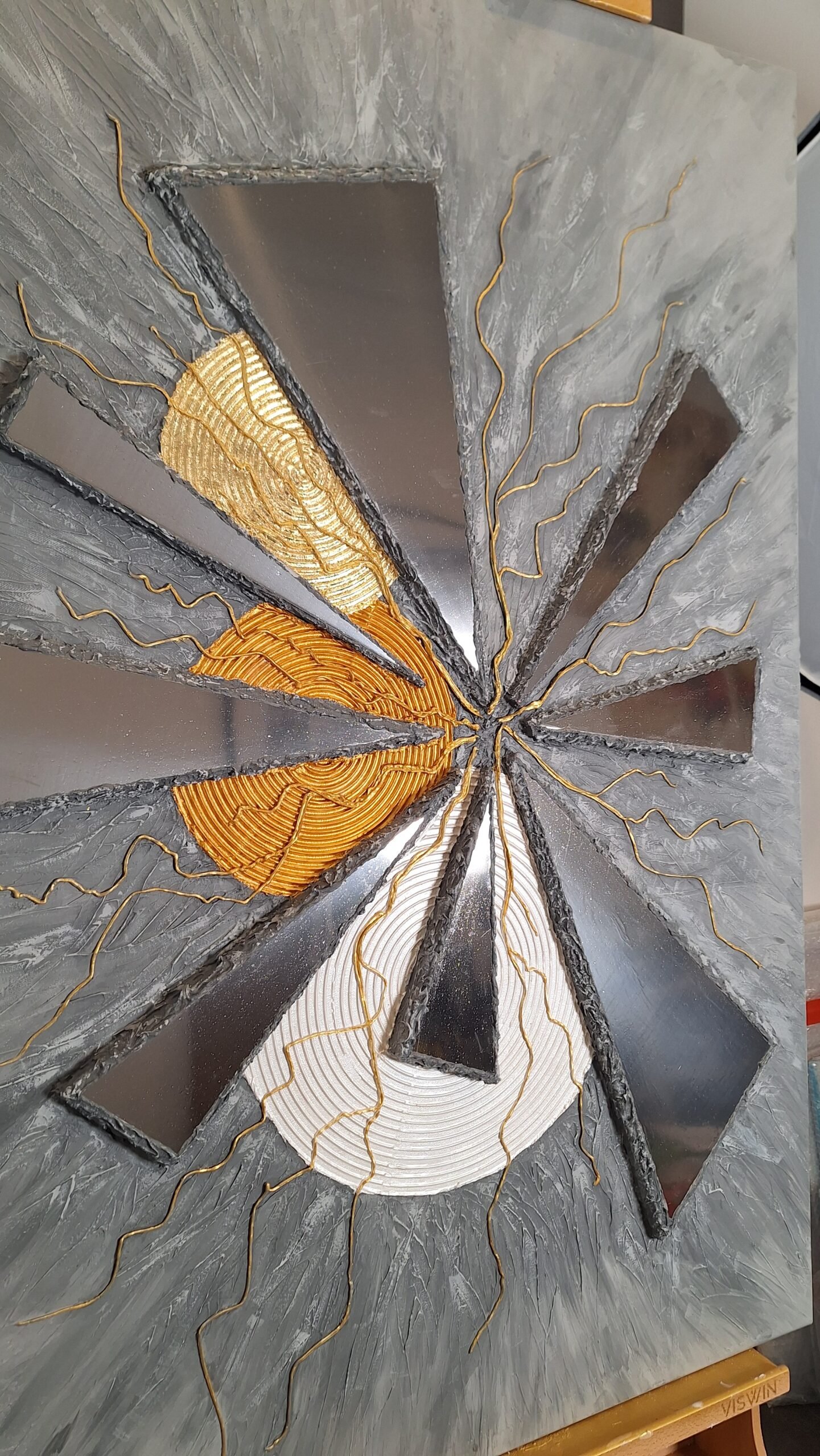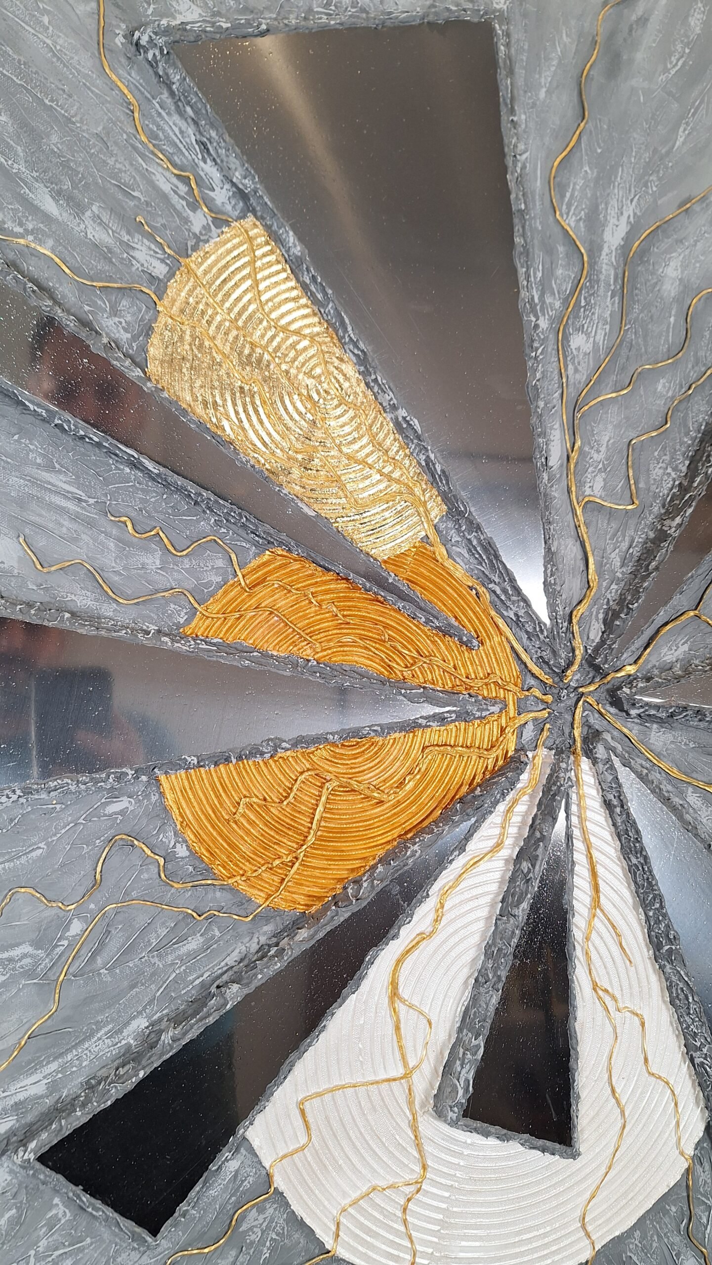 Shattered Reflection’ is now complete, though the paint is still drying. Only the final seal remains. This piece holds deep meaning for me. The soul circles, in pearlescent white, antique gold, and real gold leaf, represent different stages of life. The fractured chrome steel plates symbolize the breaking of myself and the disjointed self-image after my life crisis. Yet, like the steel, there is an indestructible core—our soul—that stays intact, no matter how broken we feel. Many of us have moments where everything seems to explode, and we lose control. This artwork reminds us that there is always a way to a new version of ourselves. Destruction leads to rebirth, and the steel plates, though fractured, reflect that inner strength.