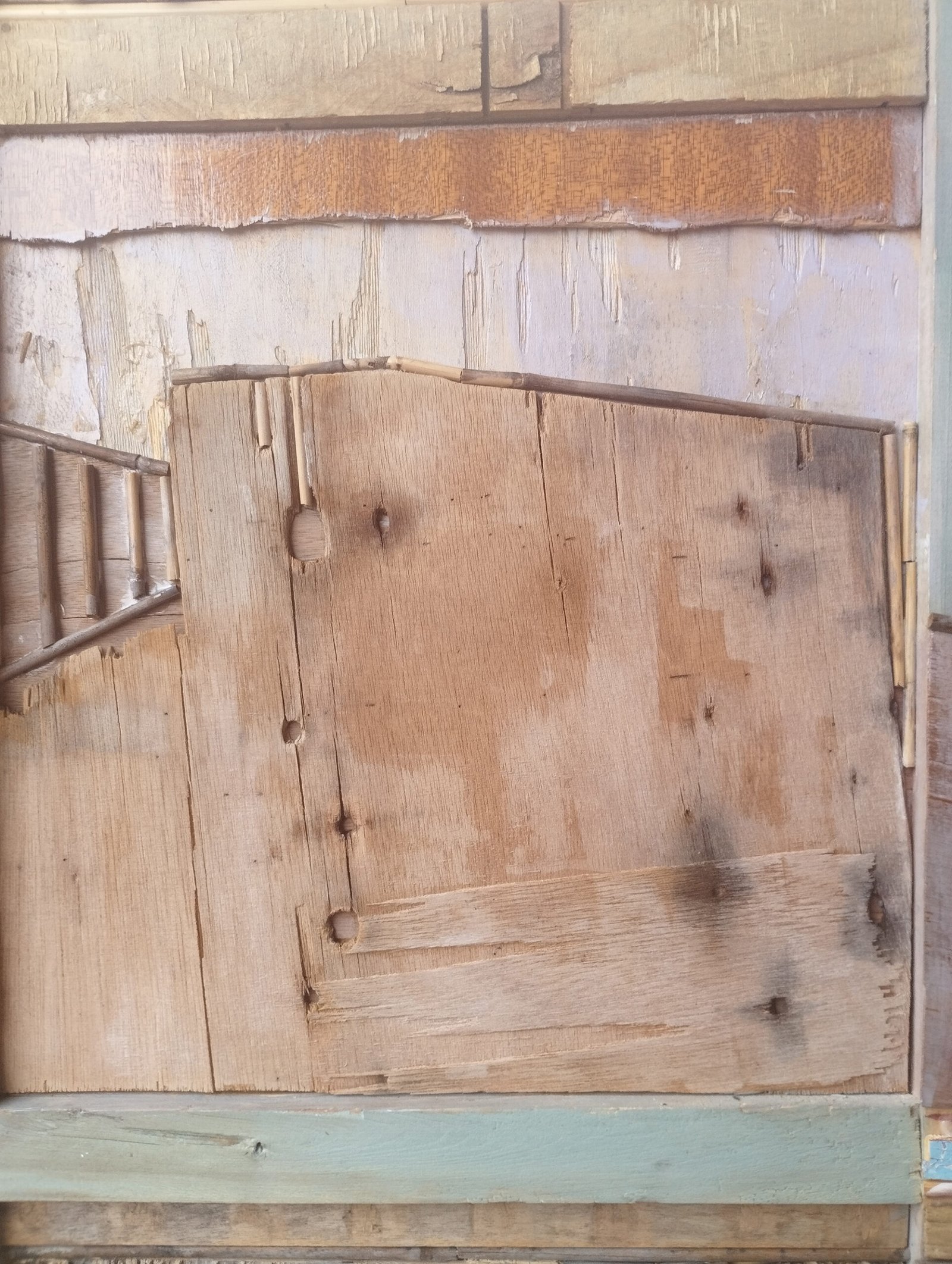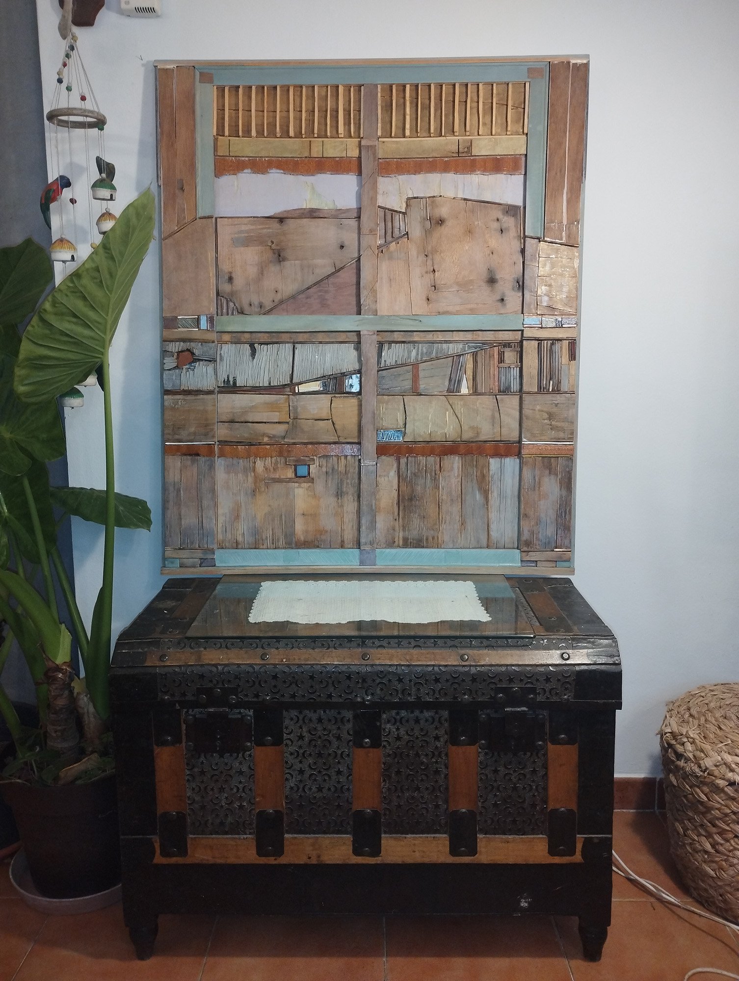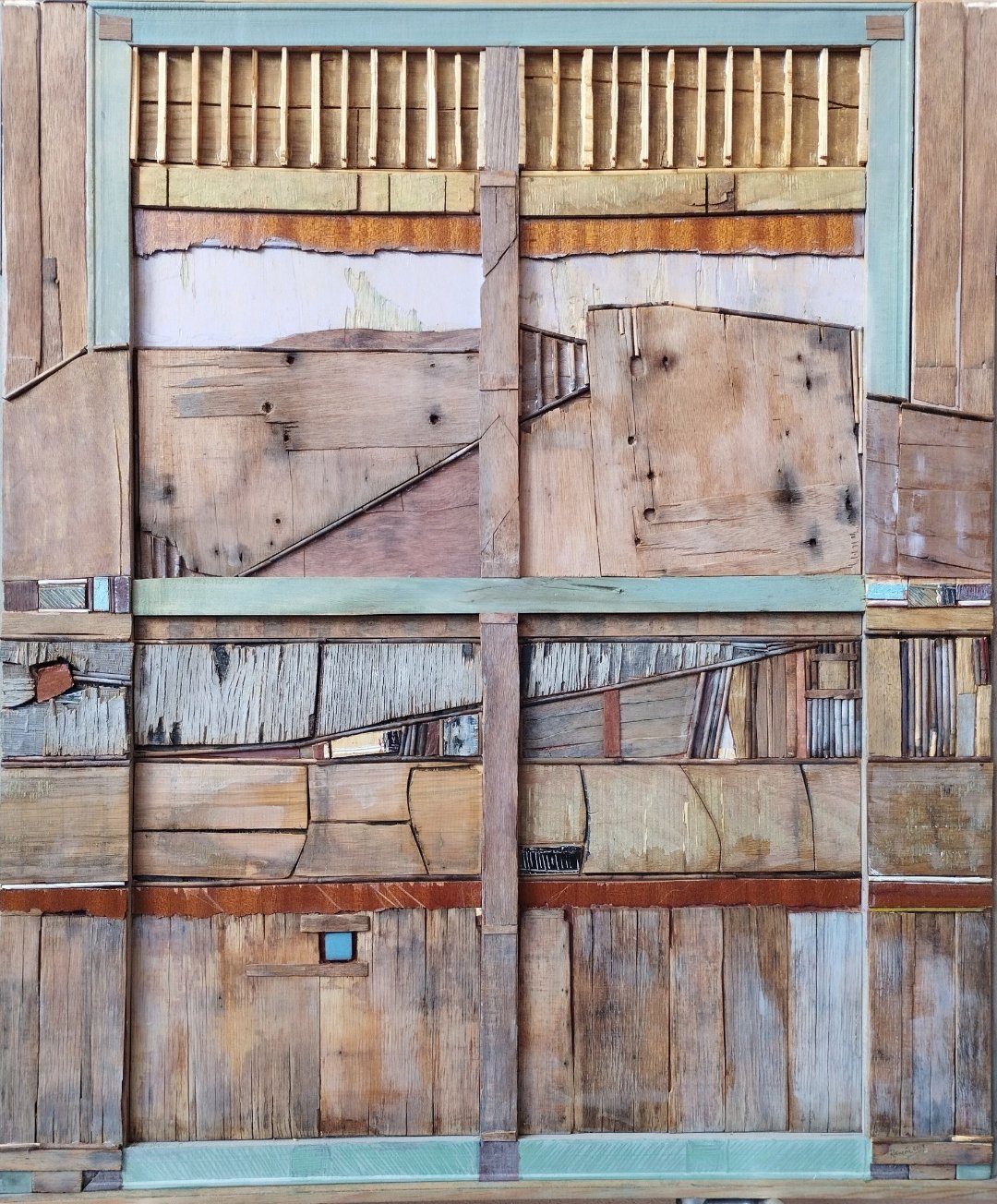 La obra contiene huellas del pasado en conexión con el presente y futuro. Mira hacia un tiempo que fue y contribuye a que siga siendo a través del arte. Recoge vestigios que un día tuvieron una utilidad determinada para resituarlos en la función social liberadora de la creación artística. Evoca espacios urbanos o rurales ya vacíos, sin color y sin vida. La obra, a través de las diferentes miradas y ventanas que ofrece, revitalizan los entornos, les da color y los elevan hacia la posteridad. El tiempo infringe un aparente caos y destrucción en la materia. La obra se sumerge en ese proceso y pone de manifiesto la belleza del trabajo y evolución de la naturaleza. Nos recuerda la necesidad de su preservación y protección.