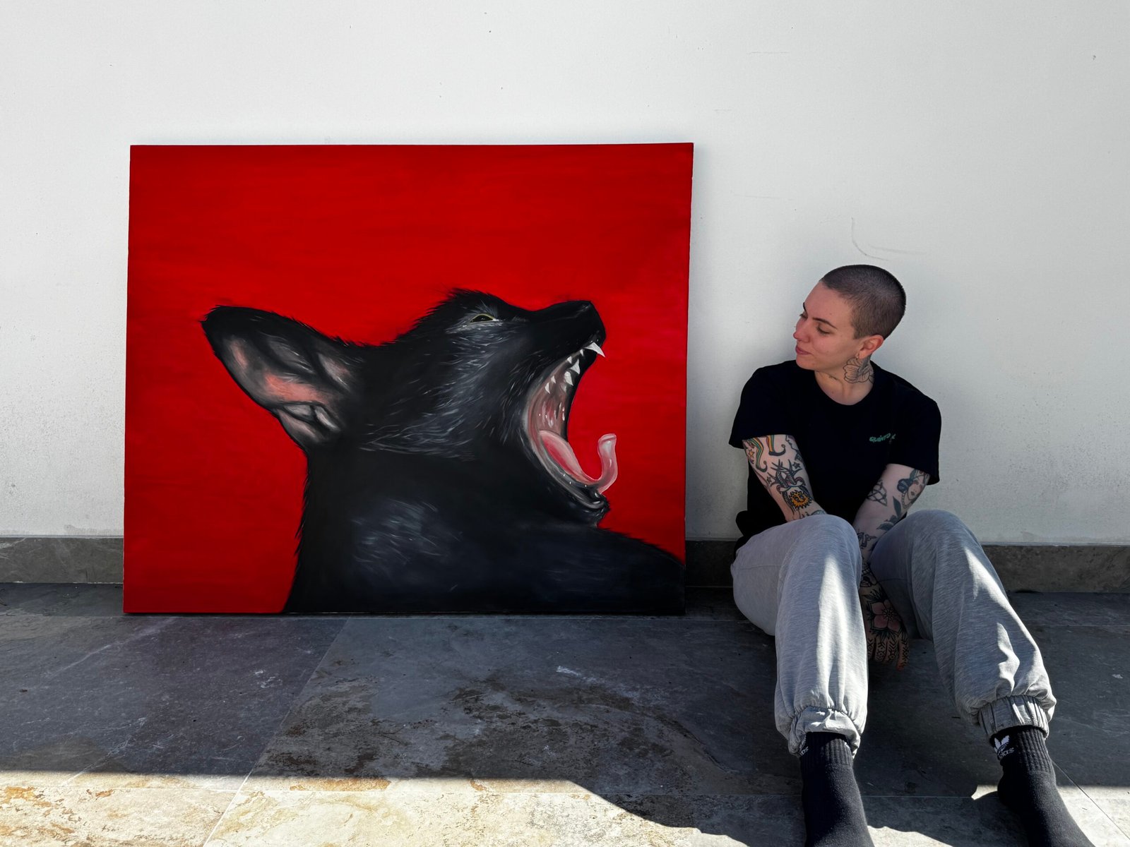 No sé si con los animales es igual pero seguramente conoceréis la leyenda del hilo rojo del destino. Quiero pensar que en cada lugar, sitio en este mundo hay un compañero animal que destaca en ese mismo instante contigo, te comprende y te acompaña en todas esas veces de soledad, compañías, alegrías, desilusiones y un largo etcétera. Negro, así se llamaba mi gato, fue ese compañero junto a mi otra compañera Jackye , en el que no me dejó sola en ningún momento. Hace un año se fué y lo acompañé hasta el último momento en el que ese hilo rojo se rompió. De ahí mi obra y su fondo rojo, porque aunque no esté, siempre quedará el recuerdo de que fue el mejor compañero de mi viaje por este mundo.