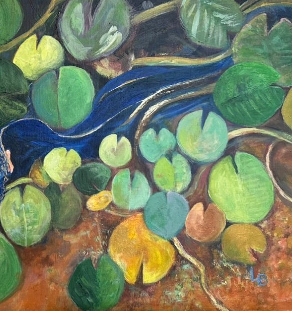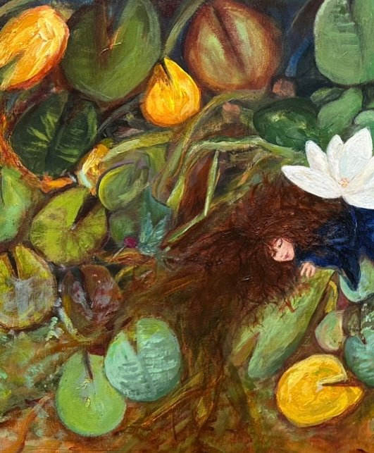 SPIRIT WARRIOR A tribute to rebirth. To every woman navigating the challenges of midlife—a journey of introspection, evolution, and transformation. Inspired by a water garden at Madrid’s Retiro Park, this piece embodies the resilience of the lotus flower, rising in full beauty from the mud. A reminder that it’s not about what happens to us, but how we choose to respond. Every strand of her hair represents us—blossoming, evolving, and seeking true freedom through deep self-awareness and connection with Mother Earth. Mystical elements emerged on the canvas without intention, waiting for you to uncover the powerful message behind this vibrant story.