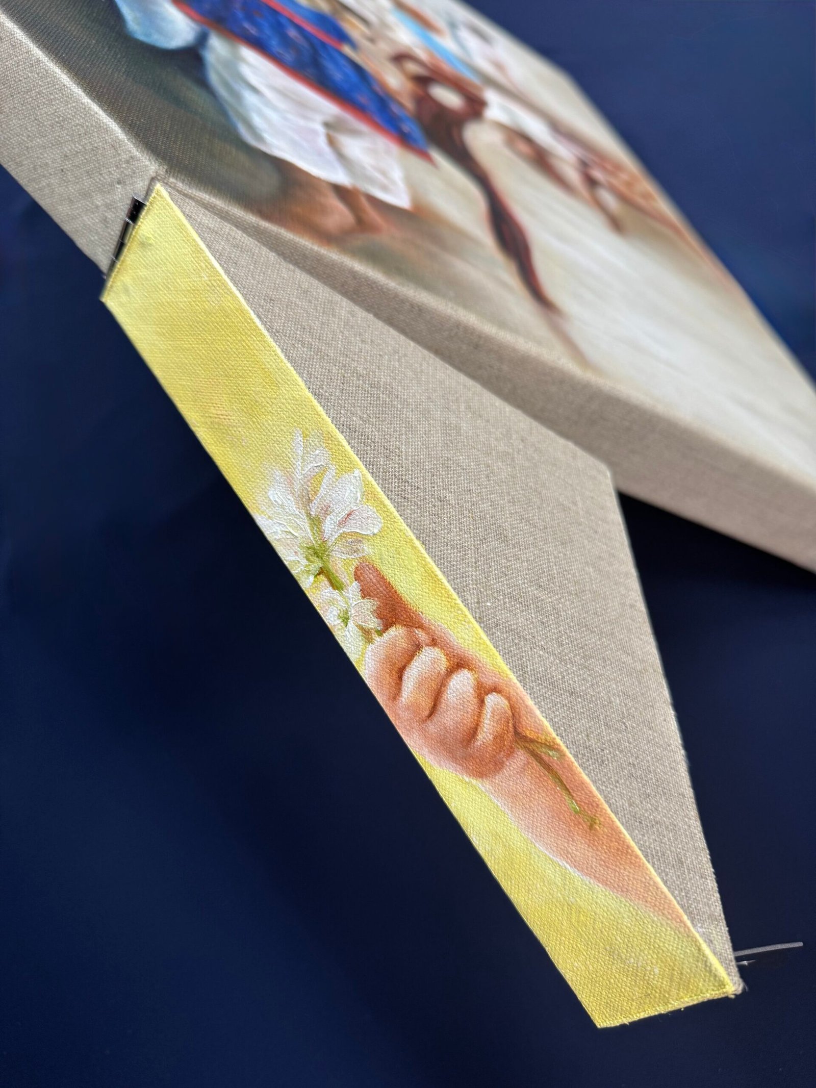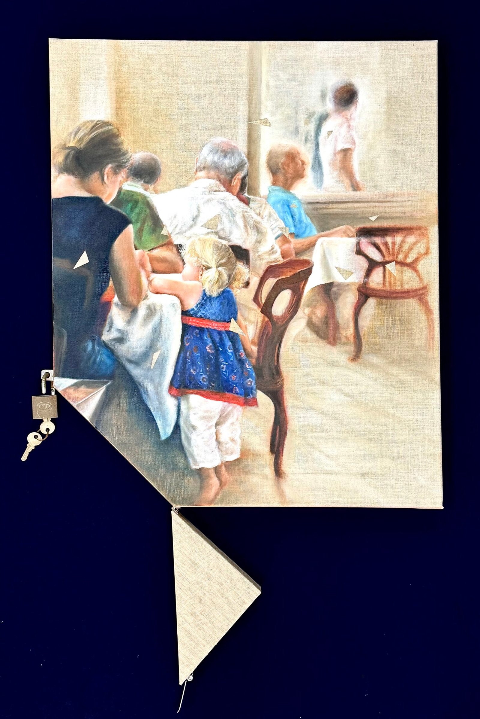 I aim to express the ups and downs of life through my work, highlighting the support and encouragement needed in adversity. As someone who struggles with emotional illness, I often feel life stands still during low points. Time seems to pass while the world moves on, creating a growing emptiness and increasing distance from reality, leading to feelings of loss and sudden tears. Even when I bravely enter a crowd, everyday scenes appear incomplete, missing a crucial piece. My artwork reflects these mundane aspects, with each person and object seeming to lack something, symbolizing my incompleteness. In the lower left corner, I’ve left a blank space with a rusted padlock. When opened, it reveals a vibrant scene filled with sweet colors and blooming flowers, contrasting with the main image. I hope this piece offers solace and positive energy, unlocking the heart and rediscovering buried joyful memories. Life may be challenging, but we can still persevere and find hidden happiness.