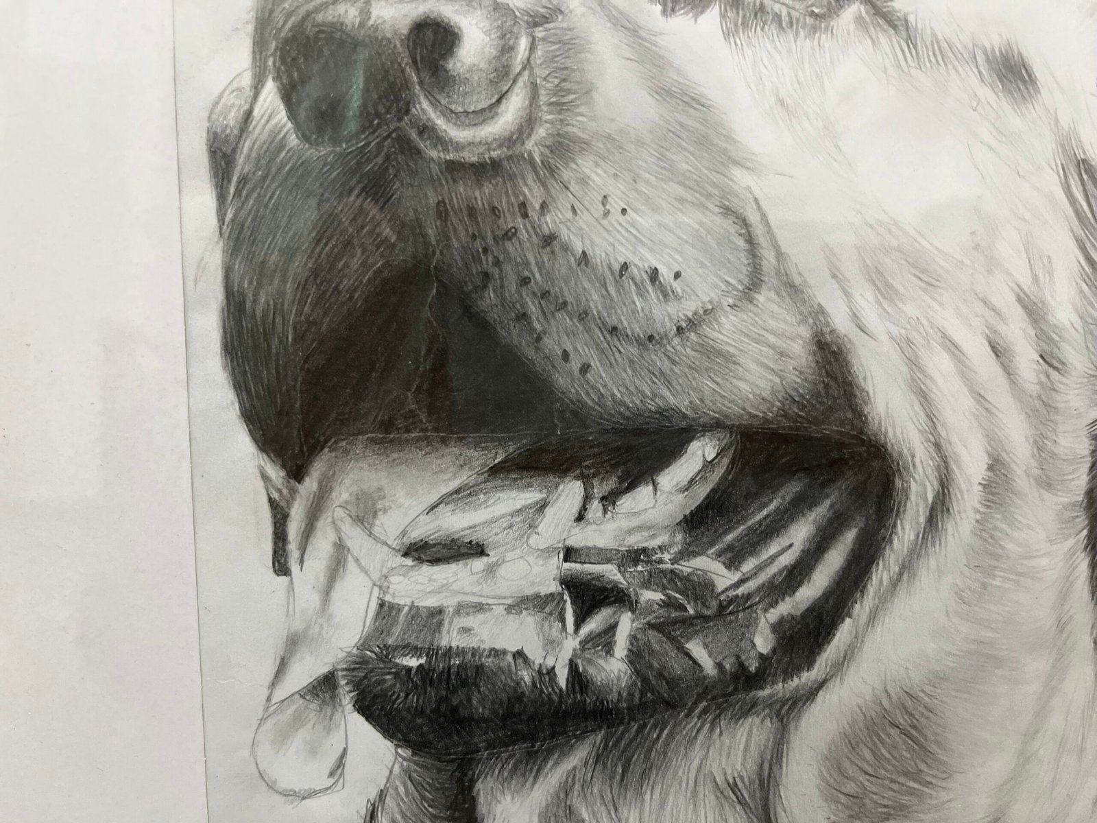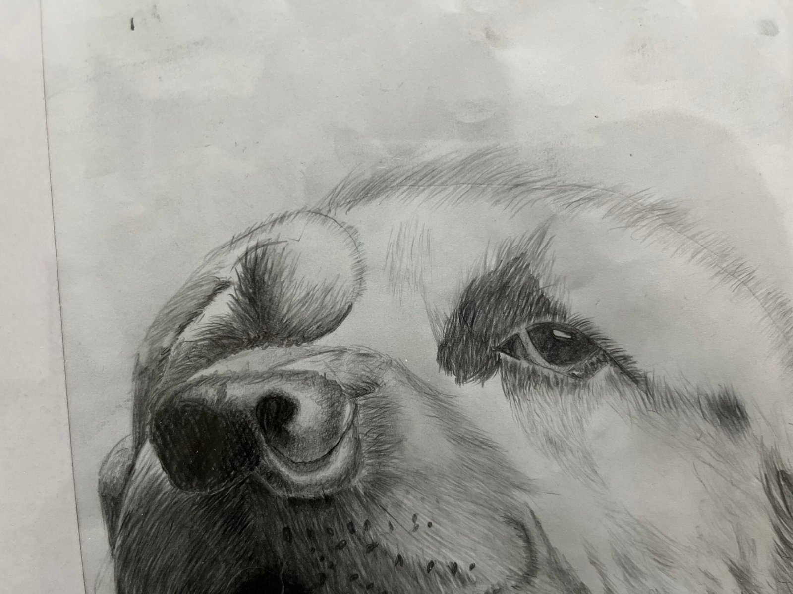This charcoal drawing represents my attempt to depict the strength, emotion, and dynamism of a dog. The dog’s eyes are the most significant part of this work for me; they convey a sense of life and energy.
