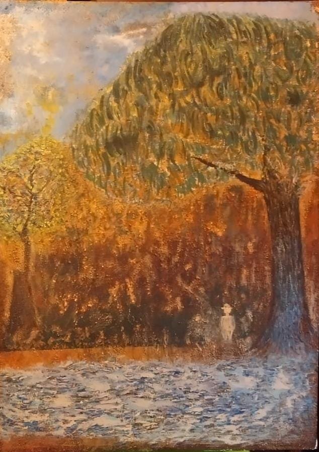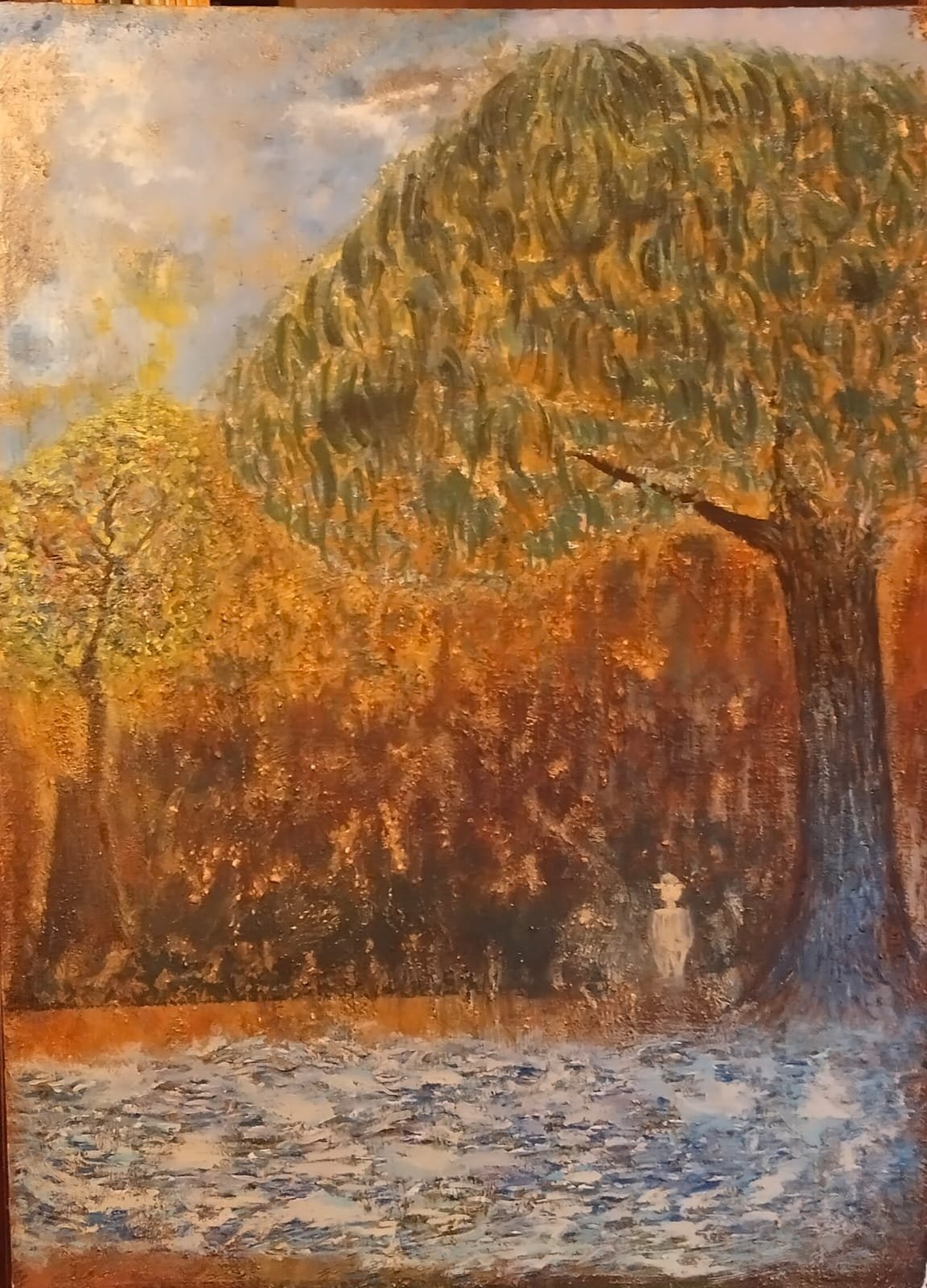 “The Vastness” captures a moment of solitude and contemplation, inviting the viewer to reflect on the connection between nature and the self. The towering willow tree dominates the composition, symbolizing resilience and grace, while the smaller, vibrant tree on the left represents growth and vitality. The textured golden tones of the background suggest the richness of life's experiences, contrasting with the serene blue hues of the sky and water, which evoke calm and introspection. The lone figure at the base of the willow tree, painted in a ghostly white, embodies the fragility of human existence amidst the immensity of the natural world. This piece is a meditation on the balance between vastness and intimacy, strength and vulnerability. .