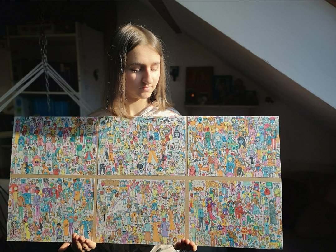 The artwork "The Whole" is composed of six parts that complement each oter. I always stres myself to choose the right colors în my drawings, so in this one, most of them were randomly chosen. Each person has a different imagination, so this artwork ca be interpreted in many ways. I like to compose beautiful things that increase your well-being and make you ask questions. Haritina Feneș