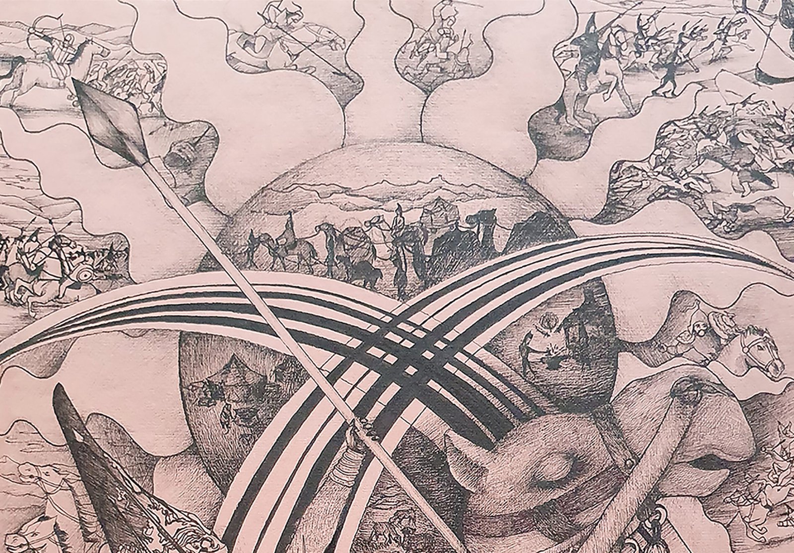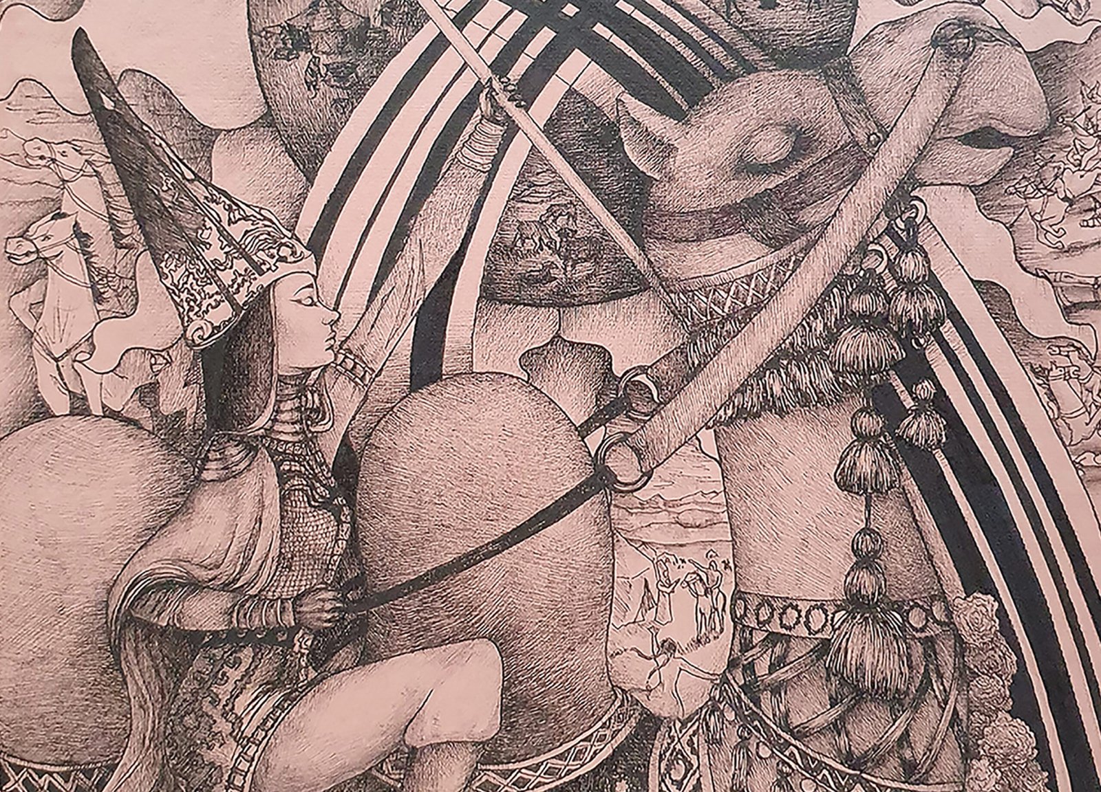 The graphic work "Tomiris" depicts a female warrior named Tomiris. She was a cult figure in the history of the Turks, the ancestors of the Kazakhs. She lived in the 6th century BC and was a strong personality, a commander who was able to rule the Turkic people in her younger years. The painting depicts her riding a camel, which also demonstrates her greatness. Her figure is depicted against the background of the sun, in which there are scenes of war and battle. Four scenes from the life of nomadic Turks are depicted in the center of the circle. These are: migrations, the work of blacksmiths, pastures with sheep and the dwelling of nomads – a yurt. Tomiris is depicted in traditional clothes with richly ornamented embroidery. The same embroidered ornamental motifs are depicted on the camel's cape.