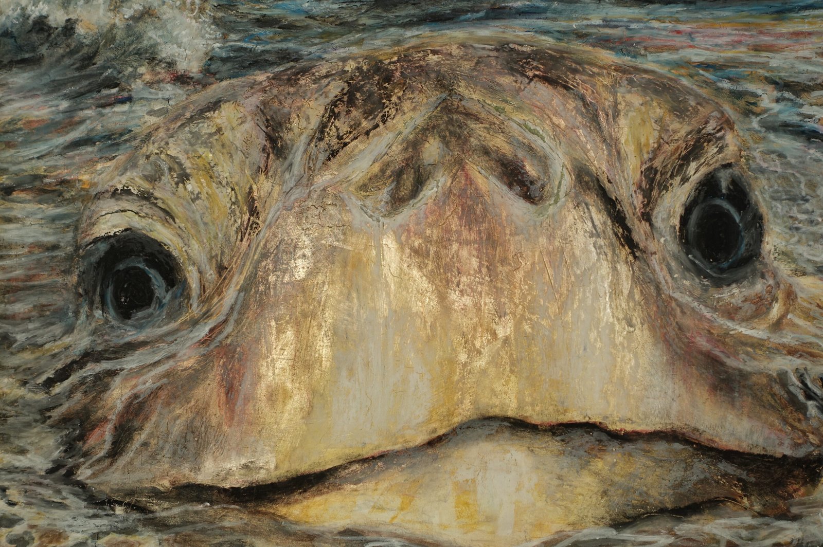 Tortuga marina disfrutando de la brisa que riza la superficie del mar al ocaso. Técnica mixta sobre madera tratada con pintura de tiza pulida.