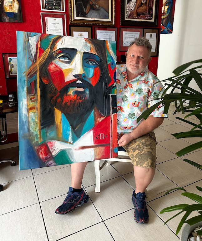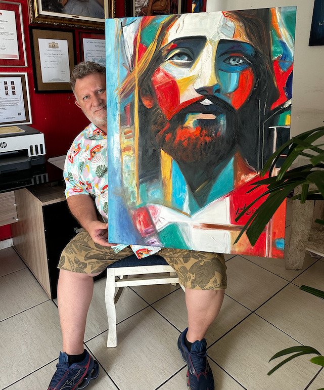 A obra "Transcendência Celestial" traz uma explosão de cores e expressão que traduz a visão do artista sobre o rosto de Jesus Cristo, em um estilo que mergulha no Expressionismo moderno. Utilizando uma paleta vibrante de cores, ViktorF compõe um cenário visualmente impactante. O rosto de Jesus, no centro da obra, se destaca pela dualidade do olhar: o olho direito voltado para o céu, enquanto o esquerdo fixa-se no observador, gerando uma conexão espiritual e introspectiva. As maçãs do rosto e a barba em tons vermelhos criam um contraste que enriquece o simbolismo da obra. Mais do que uma pintura, "Transcendência Celestial" oferece uma experiência emocional profunda, convidando o espectador a refletir sobre a fé e a humanidade por meio da arte.