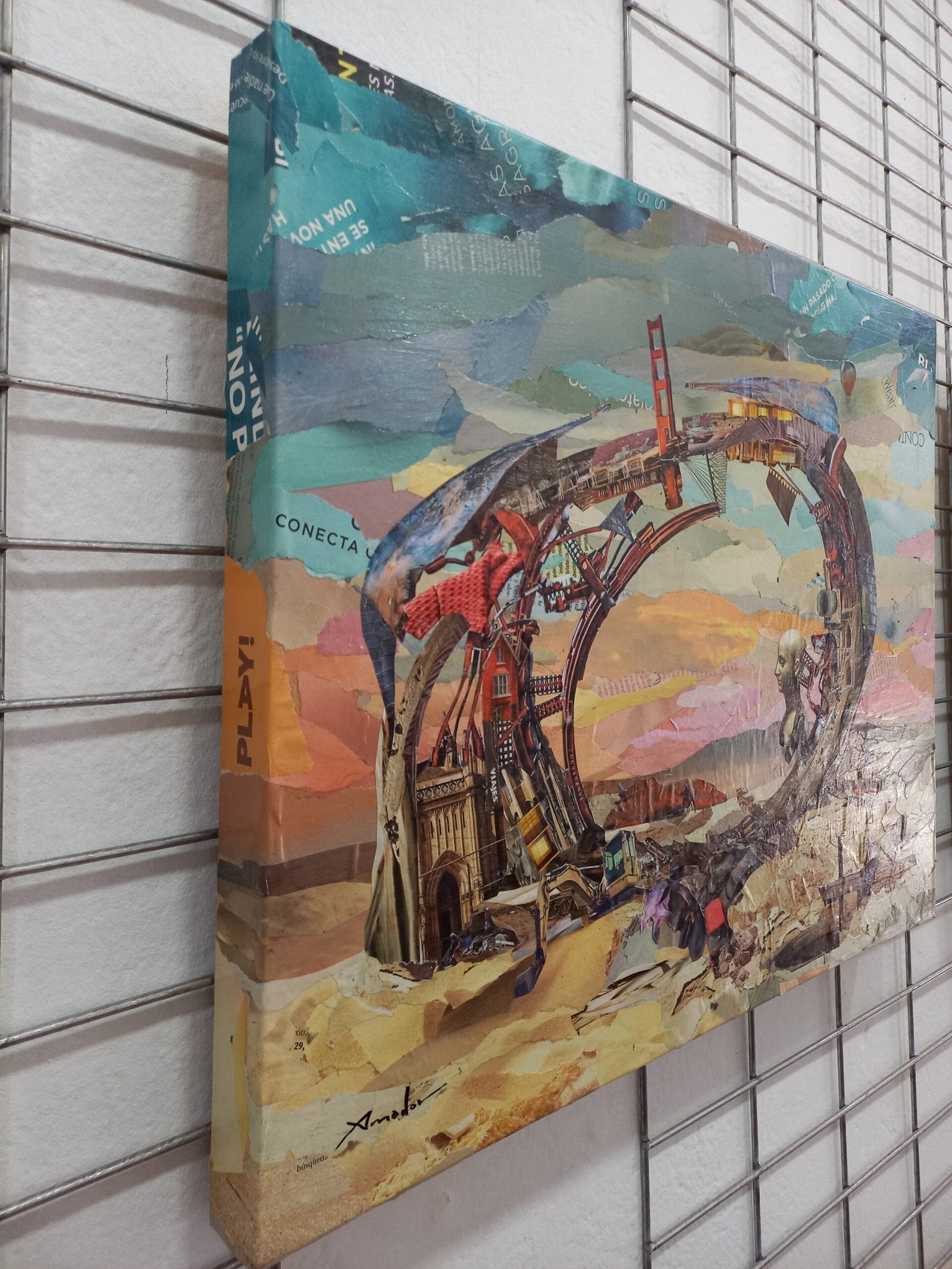 Obra realizada sobre madera con la técnica de collage, empleando exclusivamente 100% papel de revistas descartadas y cola, sin emplear otros medios plásticos. Acabada con barniz acrílico con protección UV.