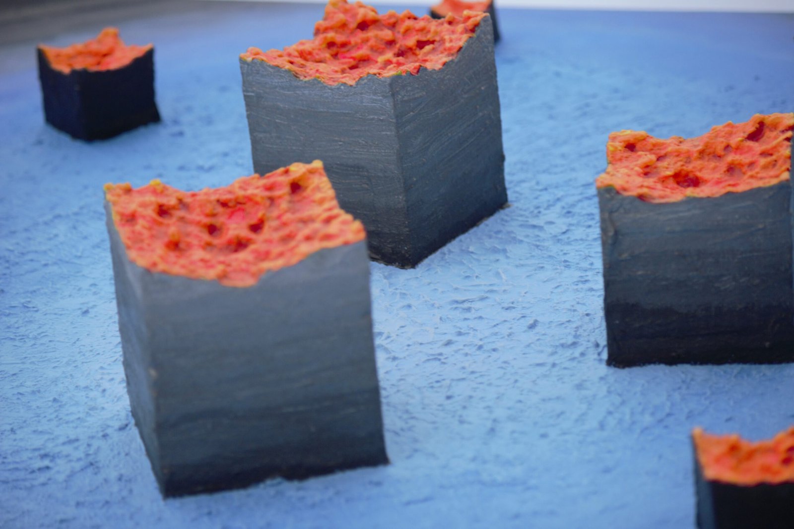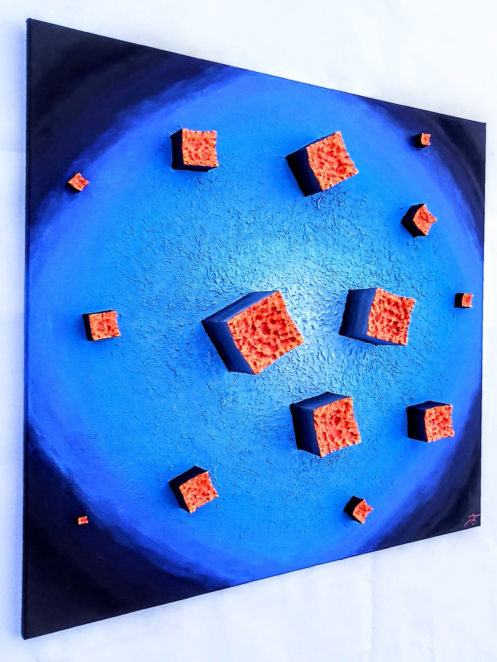 Tecnica pittorica: acrilico su tela (dettagli colore fosforescente), spessore (13cm) di spugna trattata con colla e preparatore, rilievo realizzato con il stucco. Uscire da un buco nero, e trovare una nuova dimensione, molto ampia, enorme, e moltissimo luminosa! Il quadro esce come 21° di una serie di quadri chiamati TREDISMO, una tecnica che ho sperimentato e innovato, ispirato da quadri di artisti che usano tanto rilievo. Alla fine del 2018 ho cominciato a sperimentare con rilievi forti sul pannello duro, e a metà dell’anno successivo ho realizzato il primo quadro tridimensionale su tela. Il primo quadro è stato realizzato con un cubo di spugna. La spugna, trattata, conferisce un forte effetto di morbidezza alla tela. Nel guardare il cubo pensavo ad’un nome, e mi tornava in mente la parola “cubismo” – ma certo non potevo utilizzare questo nome. I quadri cubisti sono opere in due dimensioni, mentre questo mio quadro si sviluppava in tre dimensioni: ecco che nacque il nome TREDISMO.