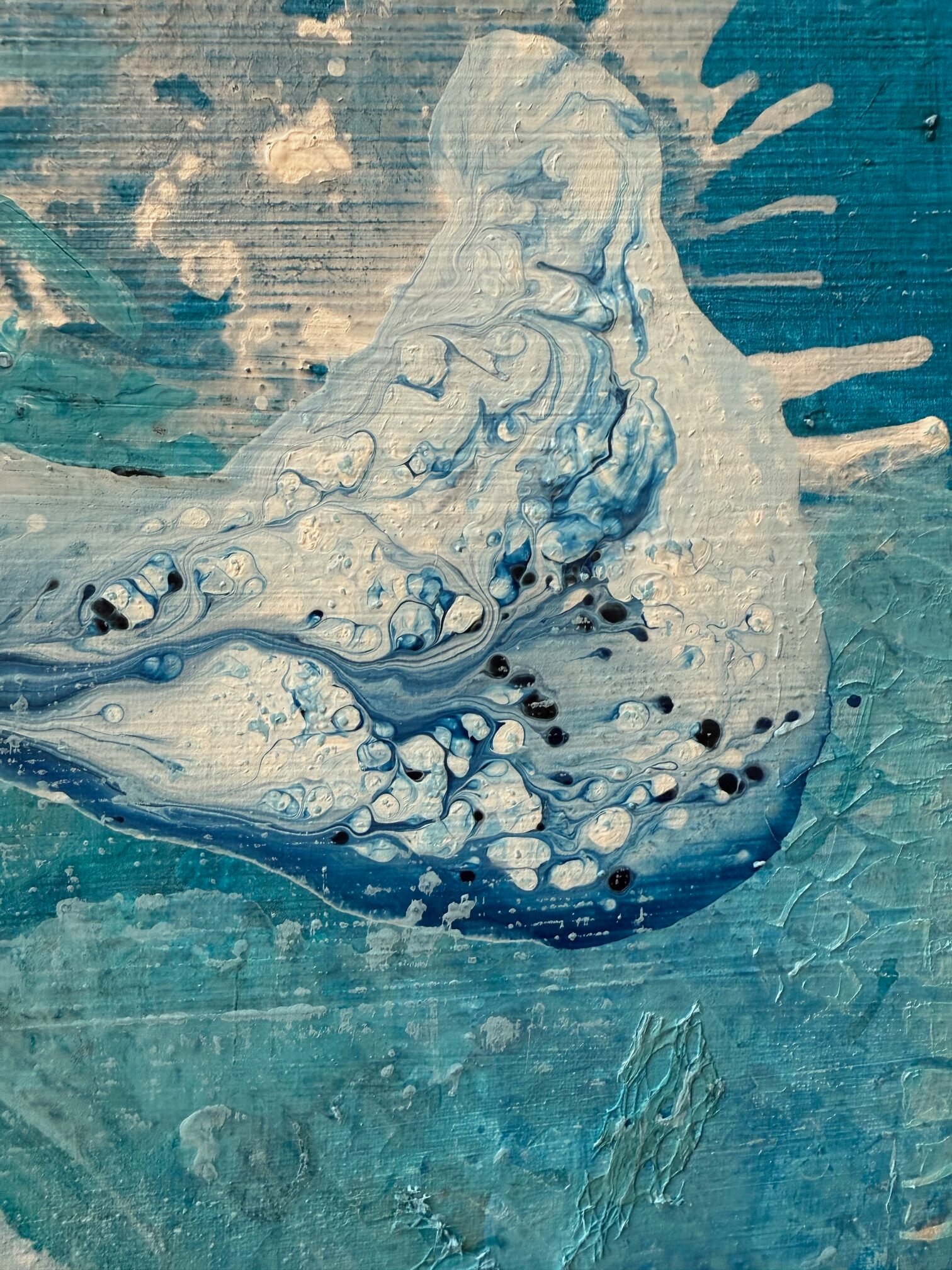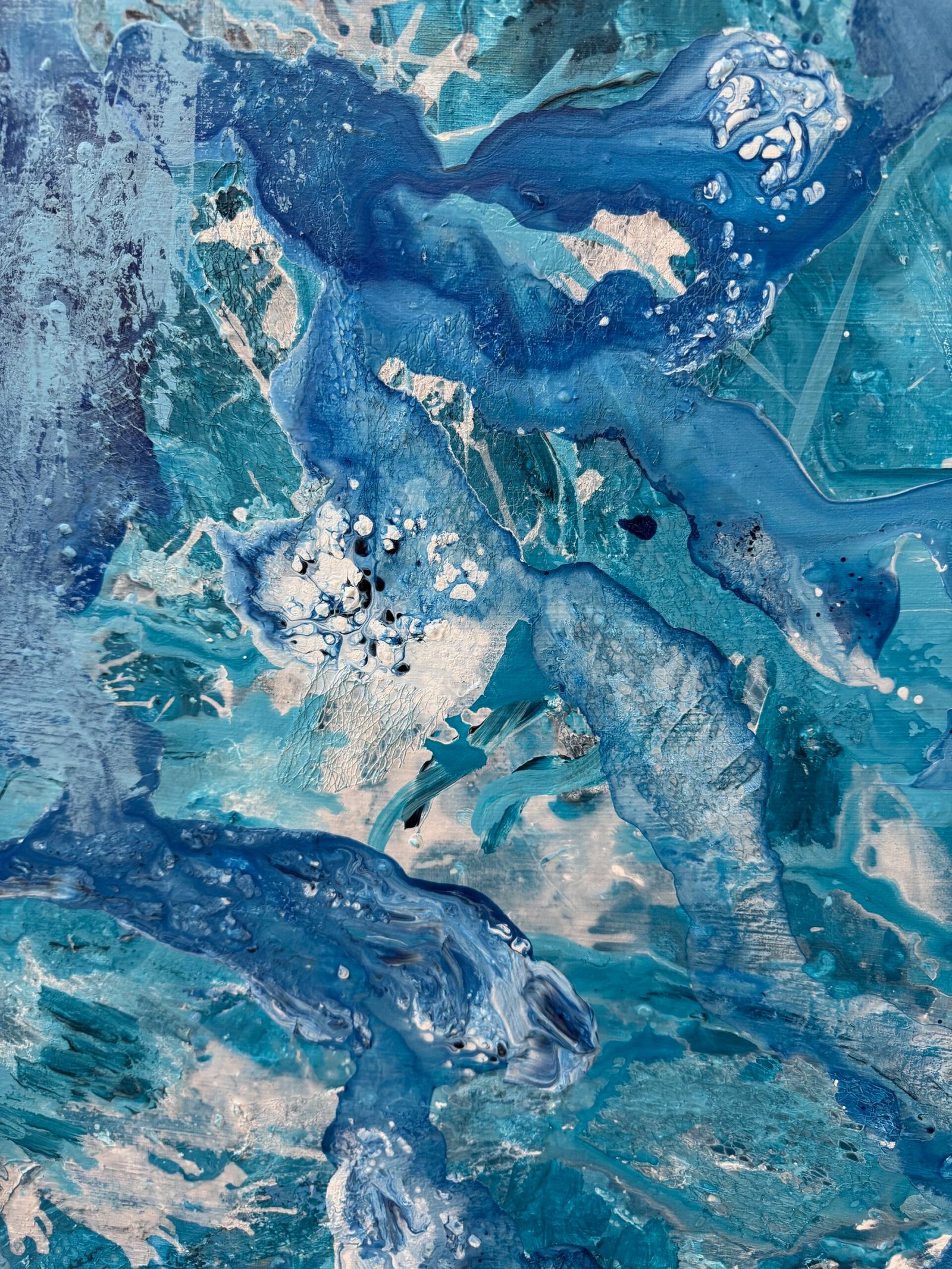 Water" is part of the series "The Four Elements", a collection that gives an insight into the essence of nature by means of abstract expression. This piece, done with acrylic painting and a mix of different techniques, reflects the fluidity ,depth , and mistery of water. The water is ever-changing, transparent, strong, and in motion and these qualities inspires me to paint the water using a variety of methods to get this richness of color tones, shadows, movements and effects. The layered composition of this work gives a sense of depth, while some areas look like the fine pattern made by fish scales, giving a very quiet signal of life underneath. The result of this work is a lively and deep experience, like the water was moving by itself. "Water" is not only a picture but also a chance to feel the beat, strength, and calm of this important element.