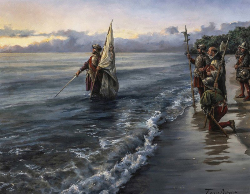 The chapter on Vasco Núñez de Balboa and his sighting of the Pacific Ocean (1513) is a tale of solitary ambition and ecstasy. The painting that immortalizes this milestone, like the epic “I Take Possession of This Sea” by Augusto Ferrer Dalmau, shows the explorer in a gesture of theatrical grandeur: standing tall, with the flag snapping in the wind. The canvas acts as the definitive summary of Zweig’s narrative: a man who, through his vision, earns the right to historical immortality.